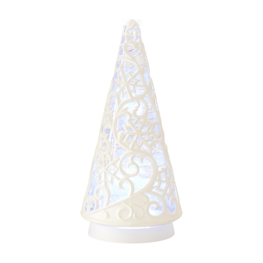 12" White Scrolled Snowflake Water Spinning LED Tree w/Timer