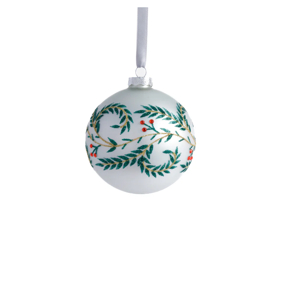 4" Metallic White Glass Ball Ornament w/ Green Leaf Design Medium