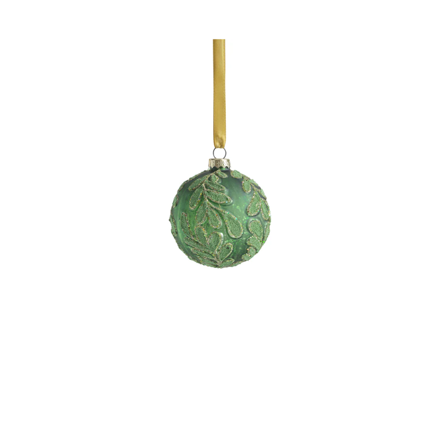 Beaded Leaf Pattern on Matt Green Embossed Glass Ornament 3.25"